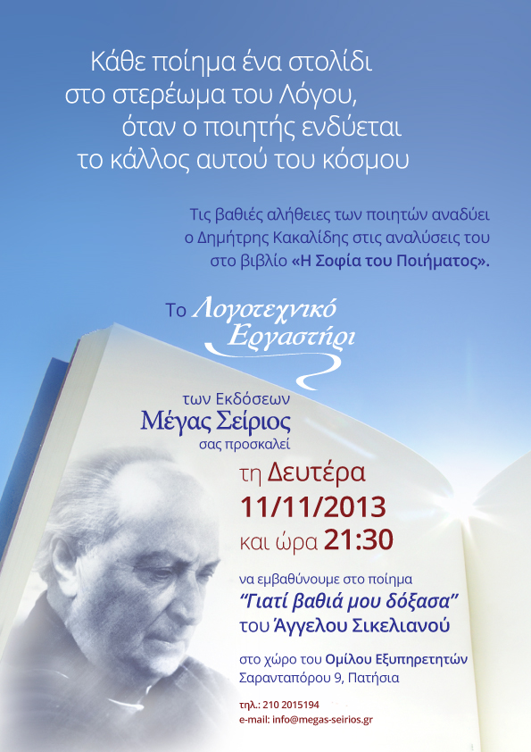 The Literary Workshop, organised by Megas Seirios Publications, invites you to discover the inspiring meanings of the poem “Because I found glory from within” by Aggelos Sikelianos, il Lunedi 11/11/13 a 21:30 at Omilos Eksipiretiton premises.