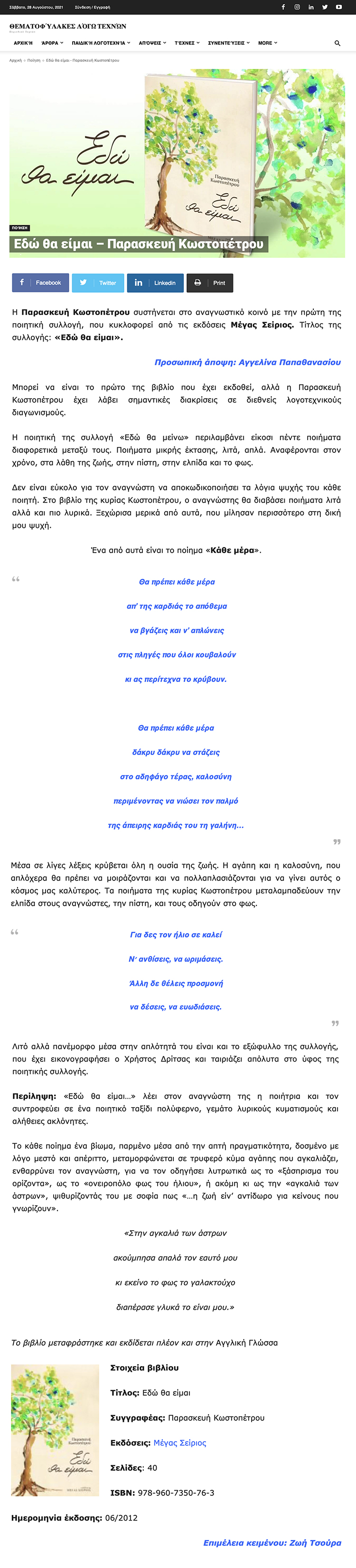 “In a handful of words lies the whole essence of life.” – review by Ms. Angelina Papathanasiou for our book “I will be here”, in the online magazine Thematofylakes Logo Texnon