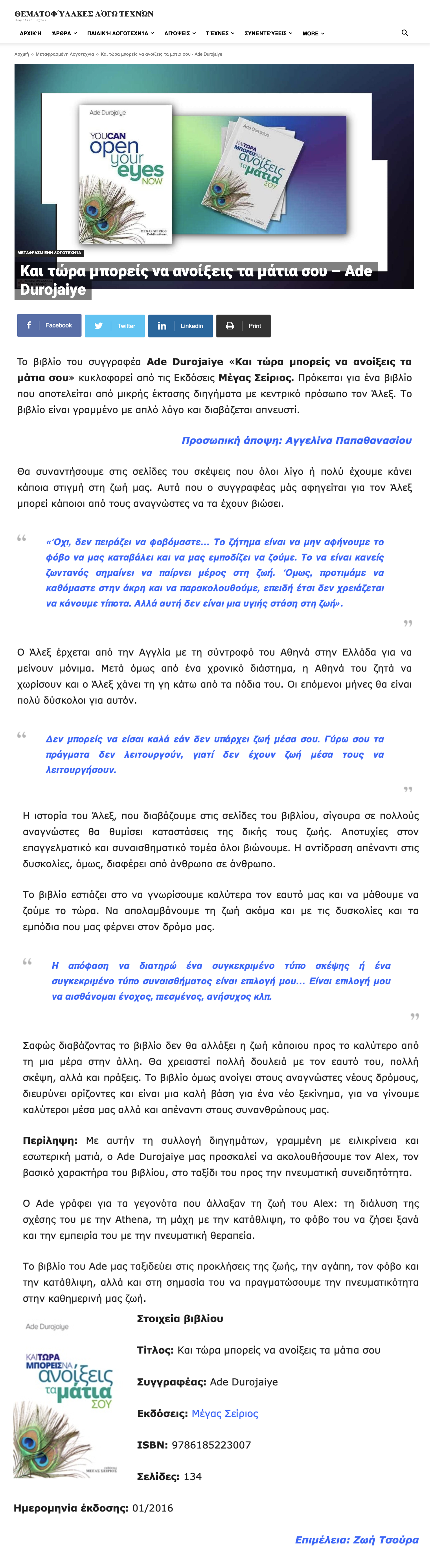 Presentation-review of our book “You can open your eyes now” by Ms Angelina Papathanasiou in the online magazine “Thematofylakes Logo Texnon”