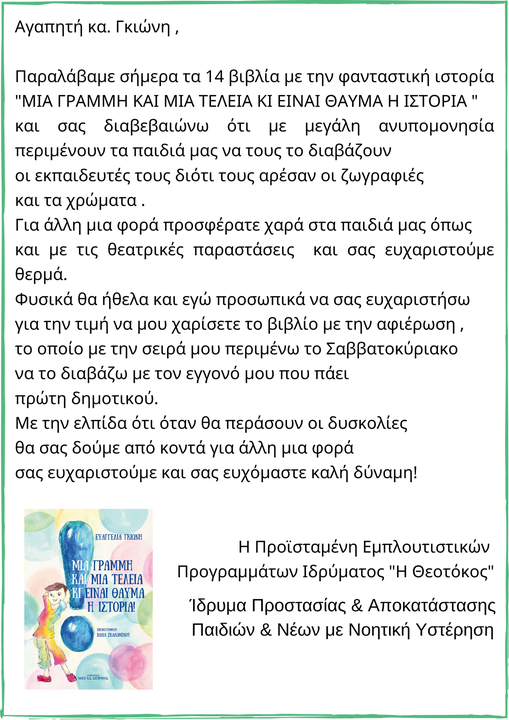 We share with you the letter of thanks from the Theotokos Foundation, a speacial needs educational institution, for the donation of copies of our fairy tale “A Line and a Dot and a Miracle on the Spot”.