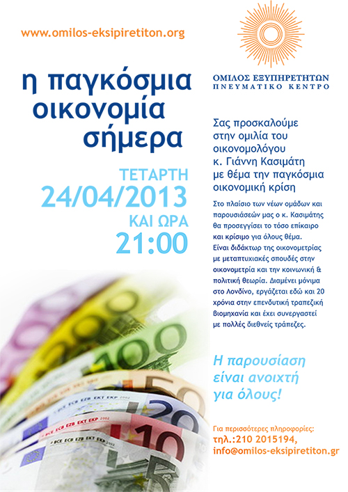 AufMittwoch 24 Aprilbei21:00 The Economist Yannis Kasimatis, Arzt der Ökonometrie mit Nachdiplomstudium in Ökonometrie und soziale und politische Theorie, einen Vortrag zum Thema gebenWeltwirtschaftskrisein unseren Räumlichkeiten.