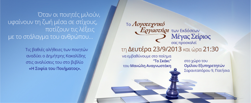 The Literary Workshop, organised by Megas Seirios Publications, invites you to discover the inspiring meanings of the poem “The Chess” by Manolis Anagnostakis, on Monday 23/09/13 at 21:30 at Omilos Eksipiretiton premises.